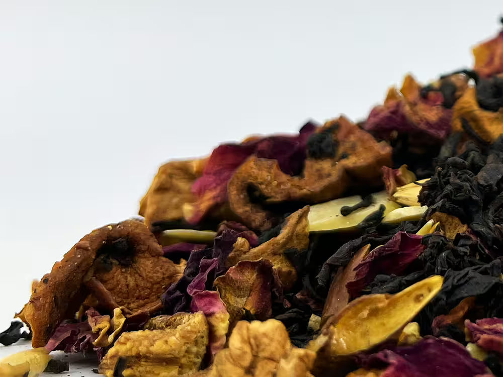 Popis Obľúbená príchuť Štedrého dňa. Čierny čaj s kúskami jabĺk, jačmenný slad, mandle (3%), okvetné lístky ruží, prírodná pomarančová príchuť, aróma. Výživové údaje na 100 ml: Energia 13 kJ />3 kcal. Tuky < 0,1 g z toho nasýtené < 0,1 g. Sacharidy < 0,7 g z toho cukry < 0,3 g. Bielkoviny <0,1 g. Soľ <0,1 g.