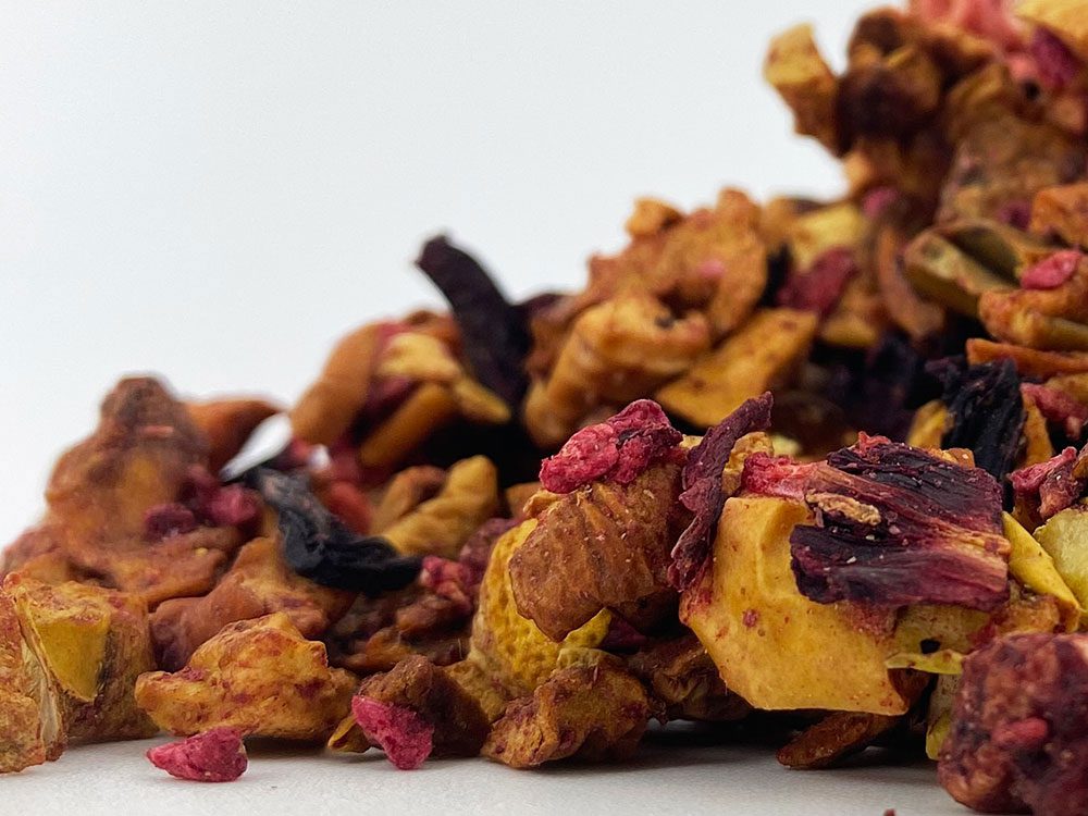 Popis Jablko, ibištek, pomarančová kôra, červená malina, jahoda, červené ríbezle, vanilka. Bez kofeínu. Nutričné údaje na 100 ml: