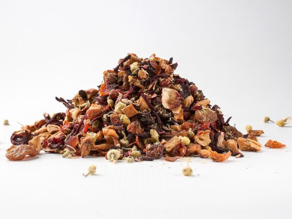 Opis Kúsky jabĺk, hrozno (hrozno, slnečnica), jahoda, ibištek, harmanček, svetlica, aróma. Bez kofeínu. Nutričné údaje na 100 ml: