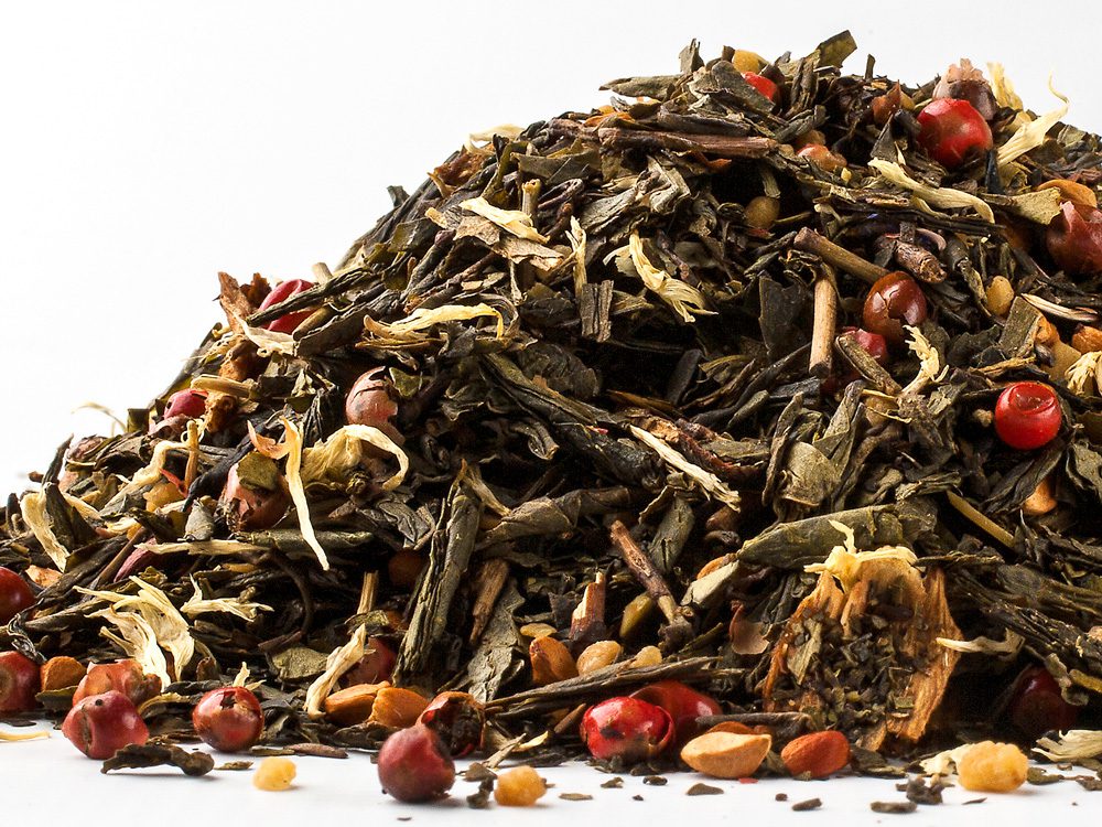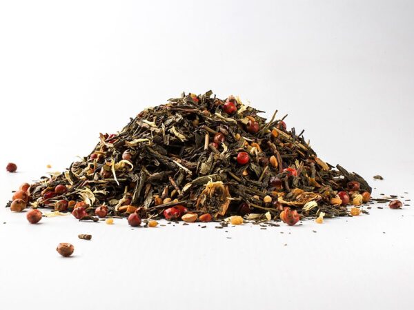 Popis Zelený čaj, kasia, jablkové lupienky (5%), škorica, pomarančová kôra, pečená ryža, okvetné lístky ruží, mandle, klinčeky, aróma. Nutričné údaje na 100 ml: Energia 5 kJ />0,1 kcal. Tuky < 0,1 g z toho nasýtené < 0,1 g. Sacharidy <0,2 g z toho cukry <0,1 g. Bielkoviny <0,1 g. Soľ <0,1 g.